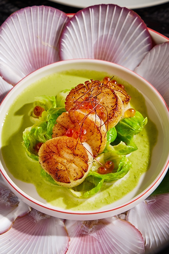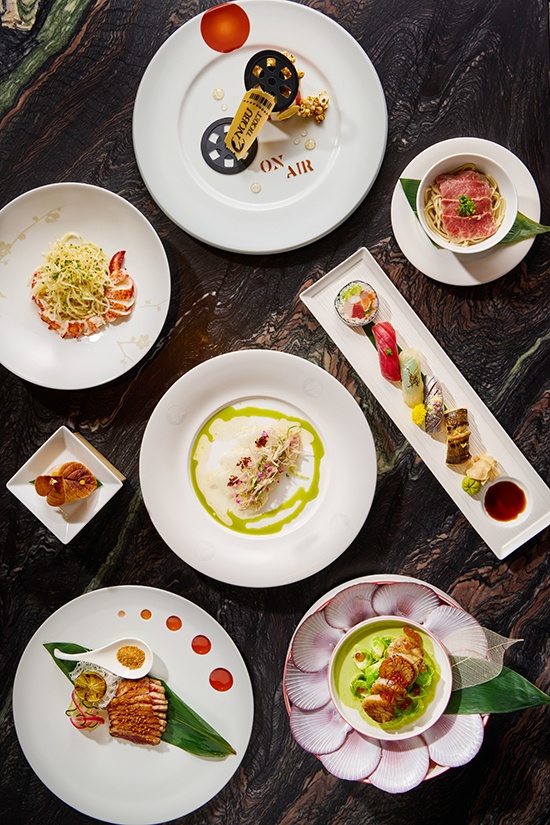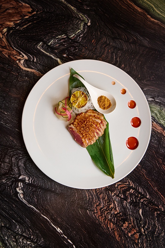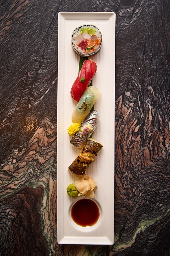 เริ่มต้นเปิดต่อมลิ้มรสกันด้วยเมนูเรียกน้ำย่อย อย่าง 'ปลาเนื้อขาวพร้อมดอกขิงญี่ปุ่นและซอสเผ็ดยูซุ' จานถัดมาคือ สลัดสุดหรู อย่าง 'สลัดมันแกว มิโสะแห้ง กุ้งลอบสเตอร์' ต่อด้วย 'คอร์สซูชิสุดพรีเมียม' ที่แสดงให้เห็นถึงความแม่นยำของเชฟผ่าน 'อากามิ ซึเกะ' ซึ่งก็คือ เนื้อปลาทูน่าส่วนเนื้อแดงที่หมักในซอสโชยุพิเศษ, ฮิราเมะ คอมบุจิเมะ หรือปลาตาเดียวที่ผ่านกรรมวิธีการหมักที่พิถีพิถัน โดยนำสาหร่ายคอมบุที่มีรสเค็มอ่อนๆ จากธรรมชาติมาประกบเข้ากับเนื้อปลาหมักทิ้งไว้เพื่อเพิ่มชั้นรสชาติที่ลึกซึ้งและความหอมกลมกล่อม, โคฮาดะ หรือปลาตะเพียนญี่ปุ่น และอานาโกะ หรือปลาไหลทะเลญี่ปุ่น โดยซูชิแต่ละคำ ให้รสชาติความอร่อยและสัมผัสได้ถึงวัตดุดิบคุณภาพชั้นเลิศ