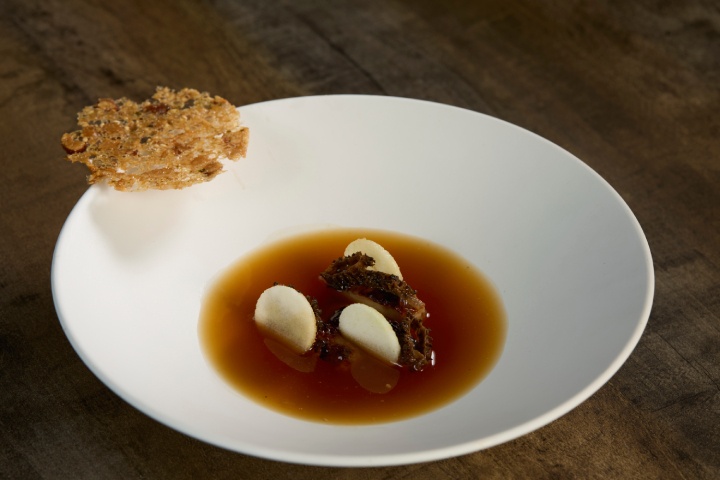 เมื่อรสสัมผัสเริ่มอบอวล “Swiss Soup” ก็ตามมาในโทนที่นุ่มนวลกว่า ได้แรงบันดาลใจจากซุปตีนไก่ แต่กลับถูกปรับให้หรูหราขึ้นด้วยการใช้เนื้ออกไก่และเห็ด เคียงด้วยปาปาดัมข้าวบาร์เลย์กรอบบาง ให้ความรู้สึกเหมือนกำลังได้ลิ้มรสความเป็นตะวันตกที่ยังซ่อนกลิ่นอายเอเชียไว้อย่างมีชั้นเชิง