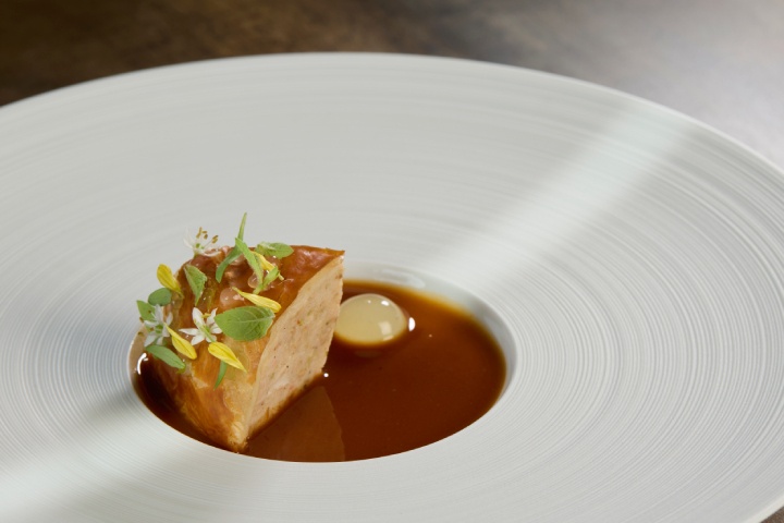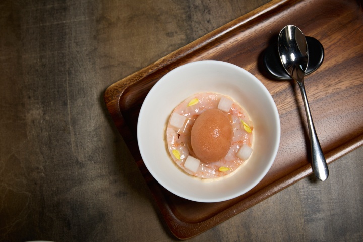 ต่อเนื่องด้วย “ขนมปังหน้ากุ้ง” ที่ยกเสน่ห์ของขนมปังฝรั่งเศสควินอามานมาเป็นเวทีหลัก เนื้อแป้งบางกรอบชั้นแล้วชั้นเล่าเคลือบคาราเมลหวานมัน ตัดกับกุ้งทอดกรอบและซอสบ๊วยสูตรเฉพาะของเชฟแท็ป ที่ชูรสชาติไทยอย่างละเมียดละไม