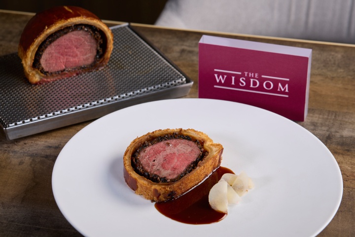 เมนคอร์สที่ทุกคนรอคอยอย่าง “Beef Wellington” ถูกนำเสนอด้วยการตีความที่ต่างไปจากเดิม ด้วยการสอดแทรกกลิ่นอายของเมนูกะเพราไว้ในไส้เห็ดดักเซลล์ผสมใบกะเพรา ห่อหุ้มด้วยแป้ง Inverse Puff Pastry สูตรเฉพาะของเชฟแอม ที่ให้สัมผัสกรอบฟูบางเบา แต่เปี่ยมไปด้วยรสเนยเข้มข้น ความกลมกล่อมของเนื้อวัวชั้นดีตัดกับกลิ่นสมุนไพรไทยได้อย่างประณีต และหากแขกท่านใดไม่รับประทานเนื้อ ทางร้านยังคงใส่ใจด้วยการปรับเมนูเป็นปลาที่มอบรสชาติละมุนไม่แพ้กัน