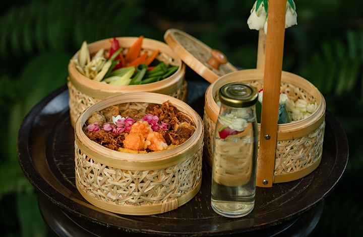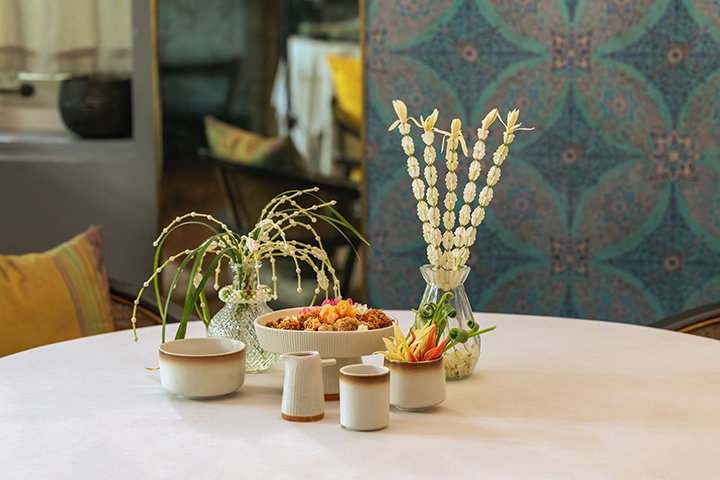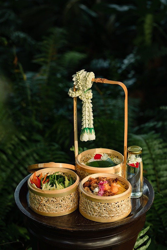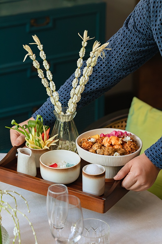 เสิร์ฟเคียงคู่กับเครื่องเคียงตำรับไทยชาววังที่จัดเตรียมอย่างประณีตทุกองค์ประกอบ อาทิ ลูกกะปิทอด หอมแดงยัดไส้ พริกหยวกสอดไส้ หมูฝอยหรือเนื้อฝอย ไชโป๊ผัดหวาน ปลาผัดหวานสูตรโบราณจากจังหวัดสุราษฎร์ธานี ไข่แดงเค็มไชยา และปลาเค็มหมูสับ พร้อมผักสดออร์แกนิกตามฤดูกาล และปิดท้ายสำรับอย่างสมบูรณ์แบบด้วยของหวานไทยโบราณ “ส้มฉุน” ที่ให้รสชาติหอมหวาน สดชื่น และกลมกล่อม