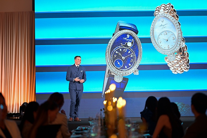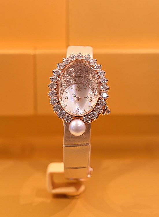 และที่พิเศษอย่างยิ่งคือการอวดโฉมเรือนเวลา Reine de Naples (แรน เดอ นาปล์) คอลเลคชั่น Haute Joaillerie (High Jewelry) ต่างๆ ที่หาชมได้ยากยิ่ง ไม่ว่าจะเป็น Reine de Naples Perles Impefrials ที่รังสรรค์ขึ้นเพื่อฉลองวาระครอบรอบ 250 ปีของแบรนด์ งดงามด้วยมุกอะโกยา ที่ขึ้นชื่อว่าเป็นไข่มุกที่งดงามสมบูรณ์แบบและทรงคุณค่าที่สุด ขอบหน้าปัดทรงรีฝังเพชร 38 เม็ดบนหนามเตยทรงพิเศษรูปหัวใจ บนหน้าปัดยังฝังเพชรทรงกลมอีก 112 เม็ด และยังประดับเพชรทรงหยดน้ำ ณ ตำแหน่ง 12 นาฬิกาอีกด้วย ซึ่งในช่วงปลายศตวรรษที่ 19 Breguet ได้นำมุกเลอค่าชนิดนี้มาจากญี่ปุ่นสู่ยุโรป ซึ่งเป็นช่วงเวลาเดียวกับที่อับราฮัม-หลุยส์ เบรเกต์ ได้รังวรรค์นาฬิกาข้อมือเรือนแรกของโลกเพื่อมอบให้แด่ แคโรไลน์ มูราต์ ราชินีแห่งเนเปิลส์ โดย Reine de Naples ถือเป็นนาฬิกาข้อมือเรือนแรกของโลก โดดเด่นด้วยหน้าปัดทรงรีอันเป็นเอกลักษณ์