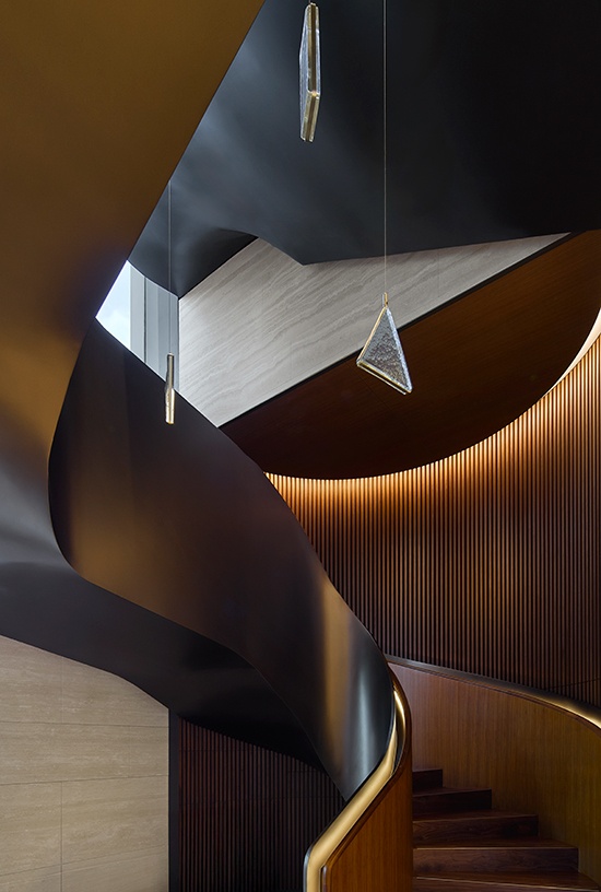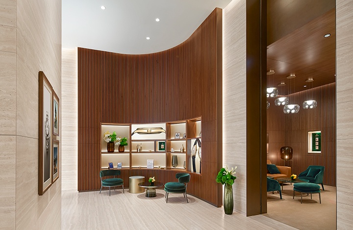 การจัดแสงไฟอย่างละเมียดละไมยังช่วยขับเน้นความงดงามของเรือนเวลา Rolex ซึ่งจัดแสดงอยู่ในตู้โชว์ที่รังสรรค์อย่างประณีต บุด้วยหนังสีเบจและตกแต่งด้วยขอบ บรอนซ์ ให้ความรู้สึกหรูหราและร่วมสมัย บูติกแห่งนี้ยังนาเสนอรายละเอียดเฉพาะที่ถ่ายทอดอัตลักษณ์ของสถานที่ได้อย่างลึกซึ้ง โดยมีผนังหินอ่อน Verde Alpi อันสง่างามเป็นหัวใจของพื้นที่สะท้อนภาพลักษณ์ของแบรนด์ผ่านโทนสี วัสดุ และองค์ประกอบทางสถาปัตยกรรมอันเป็น เอกลักษณ์ ไม้วอลนัตโทนอุ่นผสานกับหินสีเบจอ่อนอย่างกลมกลืน สร้างสมดุลระหว่างความร่วมสมัยและความงามเหนือกาลเวลา
