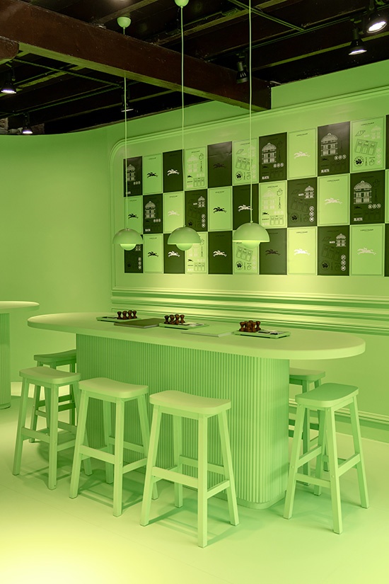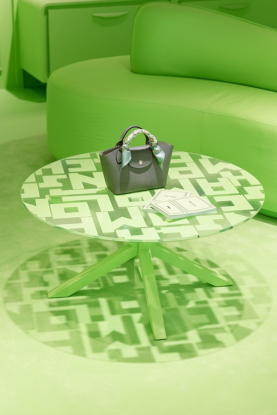 ทันทีที่ก้าวเข้าสู่ป็อปอัป จะได้พบกับโลกสีเขียวตั้งแต่พื้นจรดเพดาน ซึ่งไม่ใช่เพียงสีประจำแบรนด์เท่านั้น แต่ยังเป็นสัญลักษณ์ของความหวังและตัวตนที่ลองฌองป์ยึดถือมาตลอดหลายทศวรรษ โดยสีเขียวเข้ม (Heritage Green) ให้ความรู้สึกสง่างามเหนือกาลเวลาและความเป็นธรรมชาติ ส่วนสีเขียวอ่อน (Light Green) สะท้อนการถ่ายทอดคิดสร้างสรรค์และความกล้าที่จะค้นหาสิ่งใหม่ ๆ โดยทุกมุมมีการดีไซน์ให้มีลูกเล่นชวนสำรวจ เชื่อมโยงกับมรดกและจิตวิญญาณของแบรนด์ได้อย่างลงตัว