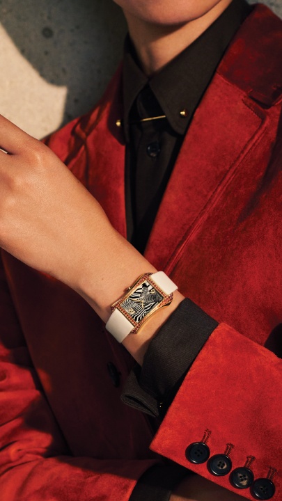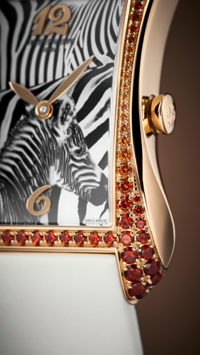 เพื่อให้ลายเส้นและม้าลายโดดเด่นอย่างชัดเจน ทางแบรนด์จึงได้ประยุกต์ใช้เทคนิคที่สร้างสรรค์และวิจิตรบรรจง ด้วยการใช้หน้าปัดคริสตัลแซฟไฟร์ ที่ถูกแกะสลักและเคลือบสีดำทั้งสองด้าน ลายม้าลายนี้ถูกเติมเต็มด้วยการเคลือบโลหะสีดำและลงยาสีขาวบนด้านล่างของหน้าปัด จึงสามารถสร้างเอฟเฟกต์ มิติและความลึก ได้อย่างน่าทึ่ง