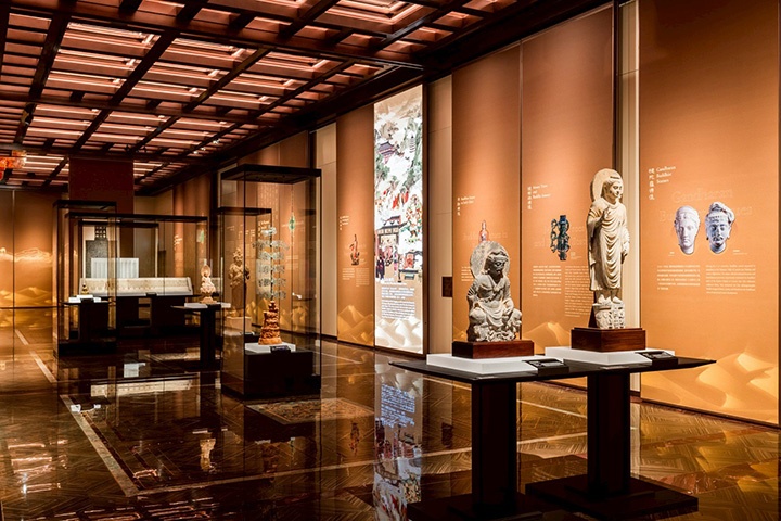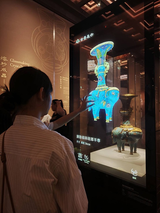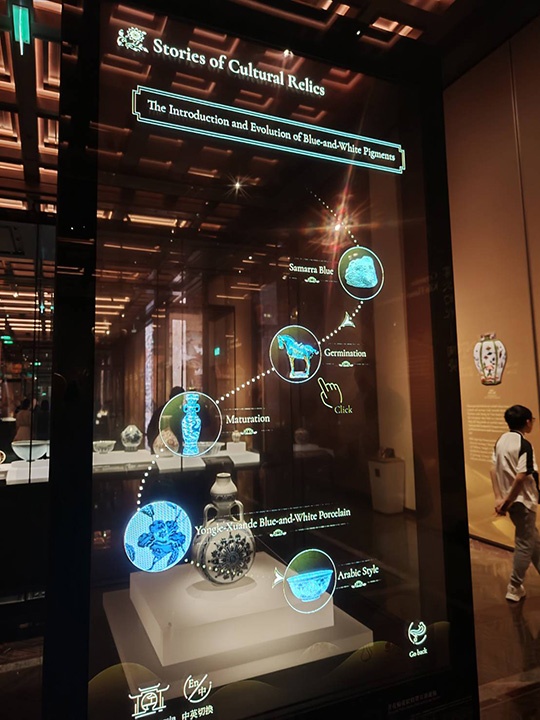 ชิ้นงานที่หลายคนหยุดชมเป็นเวลานาน คือแจกันสีฟ้าในสมัยจักรพรรดิเฉียนหลง (Qianlong period) ผู้นำชมอธิบายว่าสามารถใช้นิ้วสัมผัสที่ตู้กระจกด้านนอก เพื่อขยายภาพดูลวดลายของศิลปะวัตถุ หรือเคลื่อนนิ้วเพื่อหมุนหรือพลิกดูศิลปะชิ้นในมุมต่างๆ ได้ มุมที่จัดแสดงศิลปะตุนหวง บนผนังมีกรอบสี่เหลี่ยมเล็กๆ เมื่อส่องดูด้านใน จะเห็นภาพเคลื่อนไหวภายในถ้ำตุนหวง ประหนึ่งว่าเรากำลังเดินอยู่ภายในถ้ำ