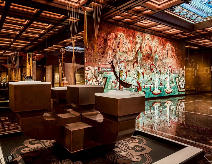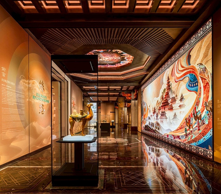 พระพุทธรูปคันธาระ จากพิพิธภัณฑ์เส้นทางสายไหมฮิรายามะ อิคุโอะ (A Gandhara Buddha statue from the Hirayama Ikuo Silk Road Museum), พิณหัวนกฟีนิกซ์ที่ได้รับการบูรณะโดยตั้นตุน (A phoenix-headed konghou restored by Tan Dun), ภาพจิตรกรรมฝาผนังจำลองตุนหวง ผลงานของทายาทมรดกวัฒนธรรมจีนสี่รุ่น (Replicated Dunhuang mural masterpieces produced by four generations of Chinese
