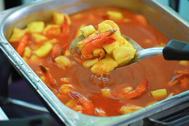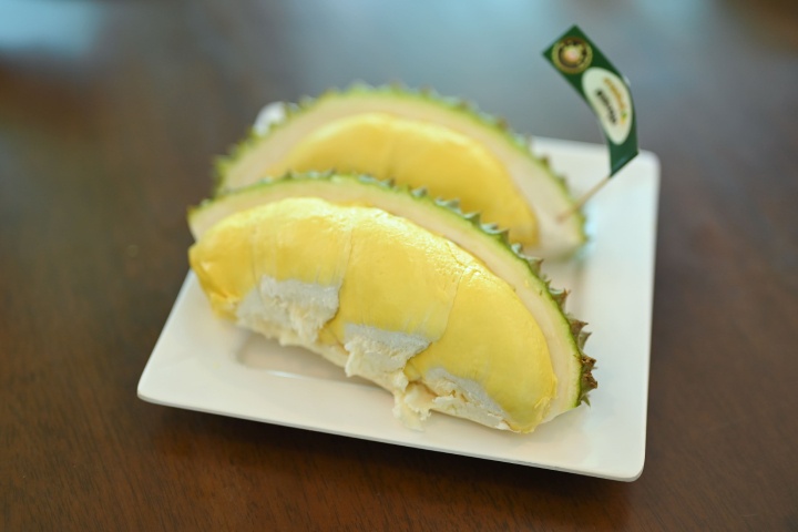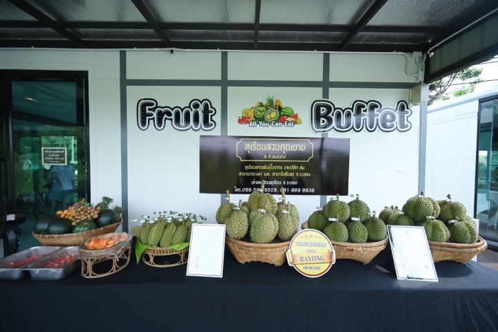 ส่วนพื้นที่บุฟเฟต์นั้นถูกจัดไว้ริมบ่อน้ำบริเวณด้านหน้าสวน ลมพัดผ่านตลอดเวลา อากาศโปร่ง ช่วยให้การนั่งกินทุเรียนที่ถูกกำหนดไว้ภายในเวลา 1 ชั่วโมง 30 นาที เป็นเรื่องสบายๆ โดยแต่ละวันจะมีทุเรียนอย่างน้อย 4 สายพันธุ์หมุนเวียนกันไป ขึ้นอยู่กับความสุกและการเก็บเกี่ยว ไม่ว่าจะเป็นหมอนทอง พวงมณี มูซันคิง หรือสายพันธุ์พื้นเมืองอย่างนวลทองจันทร์ นกหยิบ และหลงลับแล