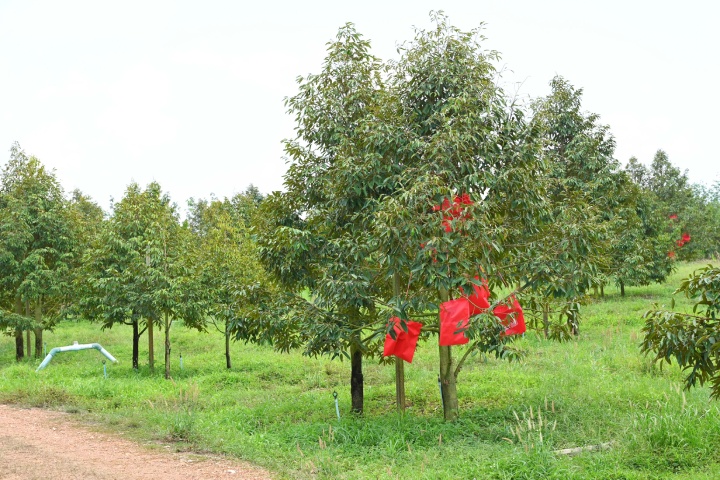 สิ่งที่ทำให้ทุเรียนของสวนนี้แตกต่างไม่ได้อยู่แค่ความหลากหลาย แต่คือวิธีการดูแลที่พัฒนาร่วมกับเกษตรอำเภอ และงานวิจัยสมัยใหม่จากสำนักงานพัฒนาวิทยาศาสตร์และเทคโนโลยีแห่งชาติ (สวทช.) โดยใช้ “ถุงแดง” ห่อทุเรียนตั้งแต่อายุประมาณ 60 วัน นอกจากจะช่วยลดโรค และทำให้เปลือกบางลง 30% แล้ว ยังช่วยเพิ่มเนื้อทุเรียนได้ถึง 15% พร้อมสีเปลือกที่สวยงาม