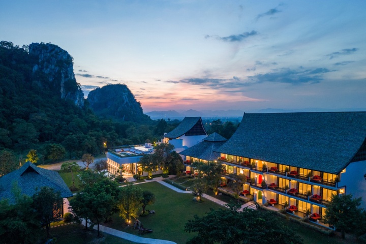 ตัวอาคารโถงล็อบบี้ ออกแบบให้เป็นสไตล์โค้งมนแบบตะวันตก ประดับด้วยม่านสีแดงผืนใหญ่สะดุดตา ส่วนตัวอาคารห้องพักโดดเด่นด้วยหลังคาไทยประยุกต์ที่มีเส้นสายลาดเอียงอย่างมีชั้นเชิง สร้างมิติทางสายตาที่สูงต่ำไม่เท่ากันจนเกิดเป็นความงามที่กลมกลืนไปกับแนวทิวเขาหินปูน