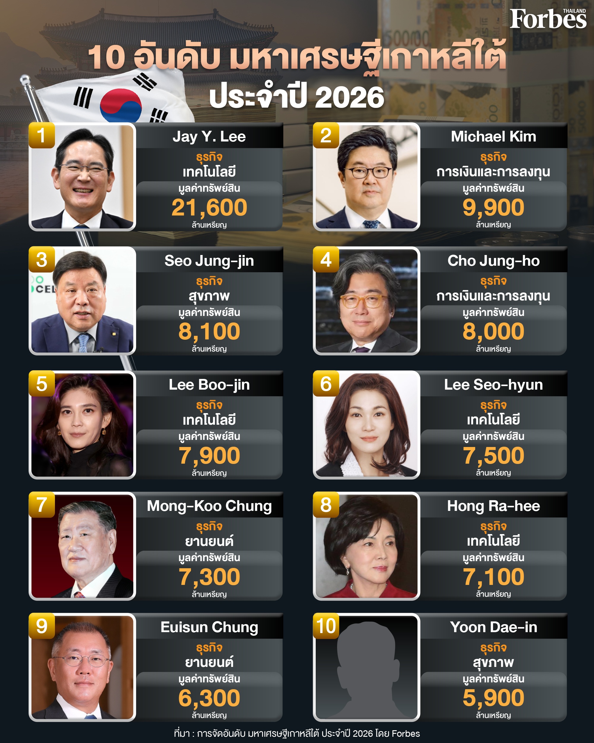 Forbes จัดอันดับ 50 มหาเศรษฐีเกาหลีใต้ ประจำปี 2026 อานิสงส์กระแส AI ดันความมั่งคั่งทำสถิติสูงสุดเป็นประวัติการณ์ มูลค่าทรัพย์สินรวมกันกว่า 1.75 แสนล้านเหรียญสหรัฐฯ “Jay Y. Lee” แห่ง Samsung กลับมาครองอันดับ 1 ในปีนี้
