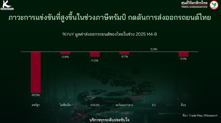 ศูนย์วิจัยกสิกรไทย มองอุตสาหกรรมยานยนต์ไทย ต้องรับมือมาตรการภาษีทรัมป์ ทั้งภาวะรุกขยายตลาดค่ายรถจีนที่ดุเดือด คาดปีนี้ไทยส่งออกเหลือ 9.2 แสนคัน แนะยกระดับมาตรฐานสิ่งแวดล้อม-ความปลอดภัยคู่ค้า เพื่อสู้ในอุตสาหกรรมแบบระยะยาว
