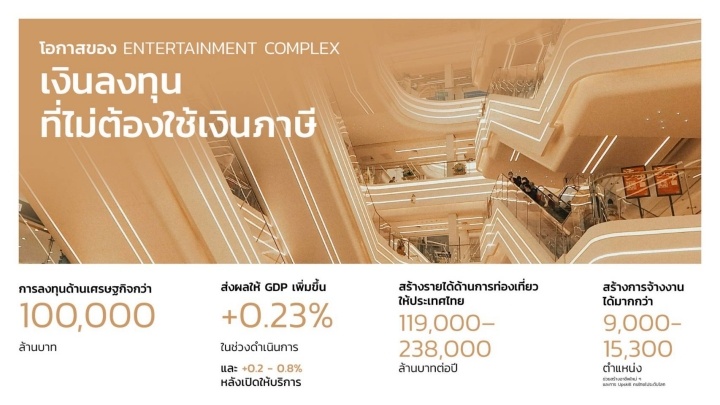 เบื้องต้นหาก Entertainment Complex เกิดขึ้นจริงในไทยคาดว่าจะมีเม็ดเงินลงทุนด้านเศรษฐกิจในไทยกว่า 100,000 ล้านบาท และเมื่อเปิดให้บริการแล้วก็จะสามารถหนุน GDP ที่ 0.2-0.8% เชื่อว่าจะสร้างรายได้ด้านการท่องเที่ยว 100,000 - 200,000 ล้านบาท จากจำนวนนักท่องเที่ยวเพิ่มขึ้น 5-20% ต่อปี และจำนวนนักท่องเที่ยวช่วง Low Season จะเพิ่มขึ้น 13% ส่วนการจ้างงานเพิ่มขึ้น 9,000 - 15,000 ตำแหน่ง