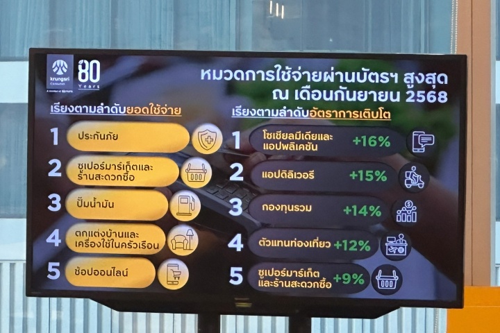 ส่วนหมวดใช้จ่ายที่มีอัตราเติบโตสูงสุด 5 อันดับแรก ได้แก่ 1.โซเชียลมีเดียและแอปพลิเคชัน (+16%), 2.แอปเดลิเวอรี (+15%) 3. กองทุนรวม (+14%), 4. ตัวแทนท่องเที่ยว (+12%) และ 5.ซูเปอร์มาร์เก็ตและร้านสะดวกซื้อ (+9%)