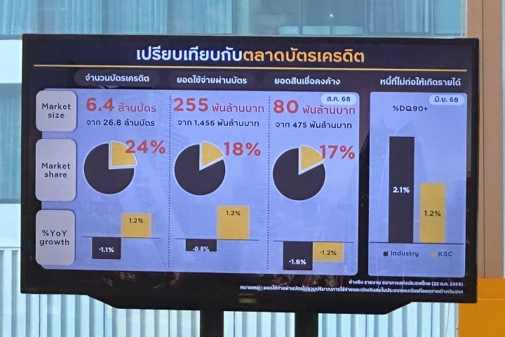โดยมียอดบัญชีลูกค้าใหม่ 422,800 บัญชี (-4.7% YoY), ยอดใช้จ่ายผ่านบัตร 286,300 ล้านบาท (+1% YoY), ยอดสินเชื่อใหม่ 68,400 ล้านบาท (-2.2%YoY) และยอดสินเชื่อคงค้าง 134,300 ล้านบาท (-2.6% YoY) ขณะที่อัตราส่วนหนี้ที่ค้างชำระเกิน 90 วัน อยู่ที่ระดับ 1.3% สำหรับบัตรเครดิต และ 2.2% สำหรับสินเชื่อส่วนบุคคล ซึ่งต่ำกว่าค่าเฉลี่ยในธุรกิจจากการบริหารความเสี่ยงที่รัดกุม
