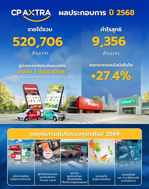 ซีพี แอ็กซ์ตร้า โชว์ฟอร์มแกร่งปี 2568 กวาดรายได้รวม 520,706 ล้านบาท กำไรสุทธิ 9,356 ล้านบาท ท่ามกลางเศรษฐกิจท้าทาย โดยได้แรงหนุนจากอาหารสด-Private Label โตต่อเนื่อง ฟู้ดเซอร์วิสขยายฐาน HoReCa ดันออนไลน์ “Makro PRO” และ “Lotus’s Smart App” พุ่ง 27.4% พร้อมเครือข่ายกว่า 2,600 สาขาทั่วประเทศ
