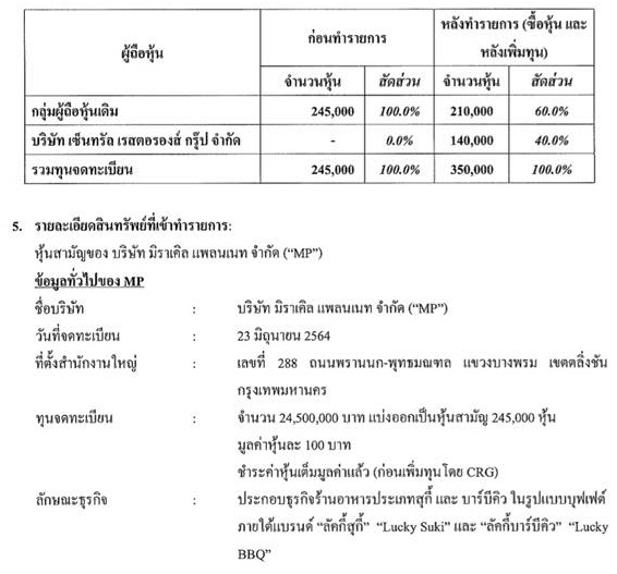 ทั้งนี้ CRG มีการลงทุนซื้อหุ้นสามัญของ MP จากผู้ถือหุ้นเดิม จำนวน 35,000 หุ้น และซื้อหุ้นเพิ่มทุนของ MP จำนวน 105,000 หุ้น โดยใช้เงินลงทุนทั้งสิ้นประมาณ 940 ล้านบาท โดยภายหลังการเข้าทำรายการในครั้งนี้ CRG จะถือหุ้นใน MP จำนวนรวมทั้งสิ้น 140,000 หุ้น คิดเป็นร้อยละ 40 ของจำนวนหุ้นจดทะเบียนทั้งหมดภายหลังการเพิ่มทุนของ MP