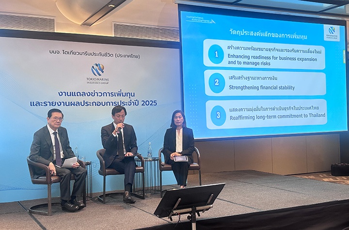 บริษัท โตเกียวมารีนประกันชีวิต (ประเทศไทย) จำกัด (มหาชน) ประกาศเพิ่มทุนครั้งใหญ่สุดนับตั้งแต่ก่อตั้งบริษัทเป็นมูลค่า 3,300 ล้านบาท เพื่อเสริมศักยภาพการแข่งขันส่งผลให้ทุนจดทะเบียนรวมหลังการเพิ่มทุนอยู่ที่ 5,582,625,030 บาท โดยการเพิ่มทุนเสร็จสมบูรณ์เมื่อวันที่ 2 ธันวาคม 2568 ที่ผ่านมา พร้อมเผยผลประกอบการประจำปี 2568 บริษัทมีเบี้ยประกันภัยรับรวม10,473 ล้านบาท ประกอบด้วยเบี้ยประกันภัยรับปีแรก 1,294 ล้านบาท โตขึ้น 14% เบี้ยชำระครั้งเดียว 700 ล้านบาท โตขึ้น 33% และเบี้ยประกันภัยรับปีต่อ 8,479ล้านบาท โตขึ้น 4%