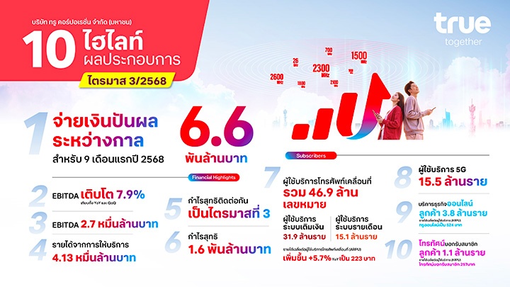 ทั้งนี้ ทรู คอร์ปอเรชั่น รายงานผลกำไรสุทธิหลังหักภาษี (Net Profit After Tax) จำนวน 1.6 พันล้านบาท ในไตรมาส 3 ปี 2568 ซึ่งนับเป็นไตรมาสที่ 3 ติดต่อกันที่บริษัทฯ มีกำไรสุทธิ แม้รายได้รวมยังคงชะลอตัวจากผลกระทบทางเศรษฐกิจ แต่ผลกำไรได้รับประโยชน์จากการได้มาซึ่งใบอนุญาตให้ใช้คลื่นความถี่
