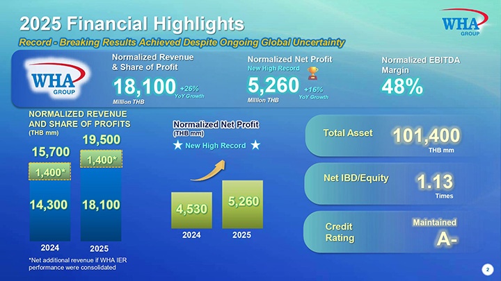 ขณะที่กำไรปกติ 5,261 ล้านบาท เพิ่มขึ้น 16% (Y-Y) ทุบสถิติรอบใหม่ สร้าง New Record High ต่อเนื่องติดต่อกันเป็นปีที่ 4 สะท้อนศักยภาพการเติบโตอย่างต่อเนื่องในทุกกลุ่มธุรกิจ พร้อมเผยทิศทางธุรกิจปี 2569 ภายใต้พันธกิจ “WHA: SHAPE THE FUTURE FOR THAILAND” เพื่อตอกย้ำบทบาทผู้บุกเบิกเศรษฐกิจใหม่พร้อมสร้างโอกาสการเติบโตให้กับประเทศไทย