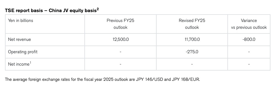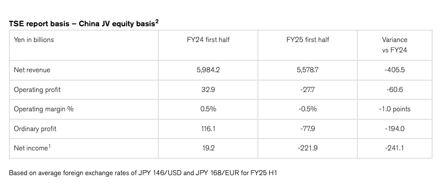 ตารางต่อไปนี้สรุปผลประกอบการทางการเงินของนิสสันในช่วงครึ่งปีแรกของปีงบประมาณ 2568 ซึ่งคำนวณตามวิธีการบัญชีส่วนได้เสียของกิจการร่วมค้าของนิสสันในประเทศจีน