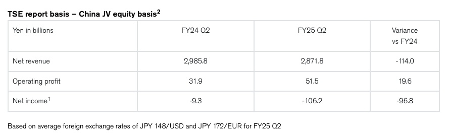 ตารางต่อไปนี้สรุปผลประกอบการไตรมาสที่สองของปีงบประมาณ 2568 ซึ่งคำนวณตามวิธีการบัญชีส่วนได้ส่วนเสียของกลุ่มบริษัทร่วมทุนในประเทศจีน