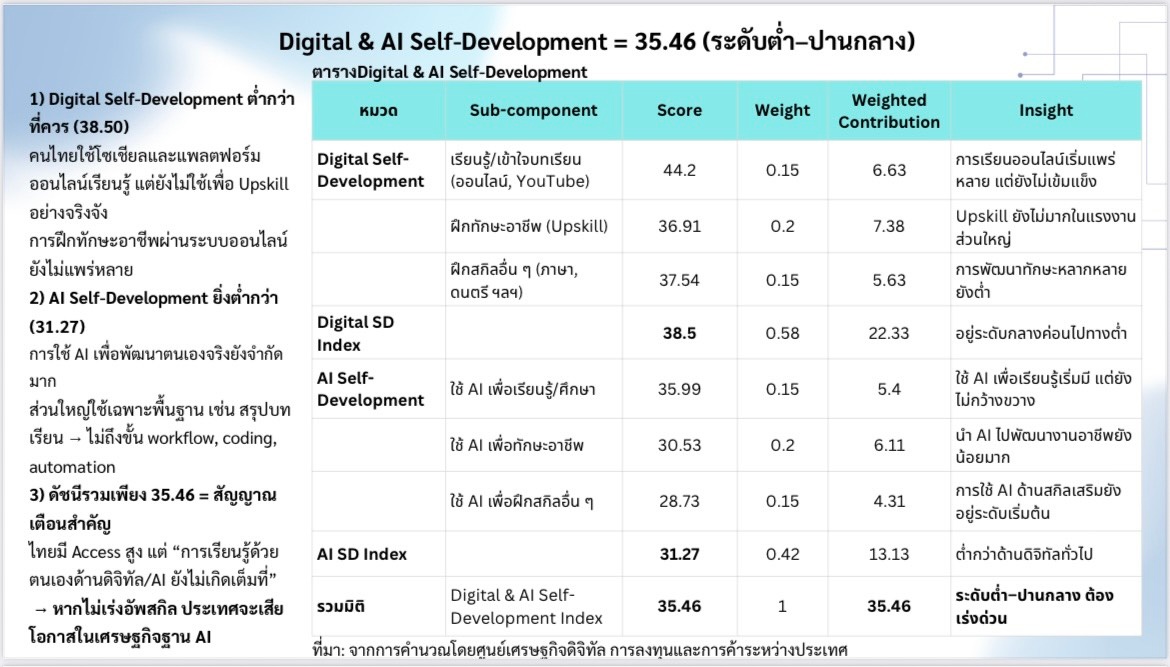 อนุสรณ์ กล่าวว่าในทางตรงกันข้ามคะแนนด้านทักษะดิจิทัลอยู่ที่เพียง 44.04 คะแนน ซึ่งอยู่ในระดับ ‘ปานกลางค่อนต่ำ’ เมื่อเทียบกับมาตรฐานสากล ขณะที่การพัฒนาตนเองด้านดิจิทัลและ AI มีคะแนนเพียง 35.46 ถือว่าต่ำมาก
