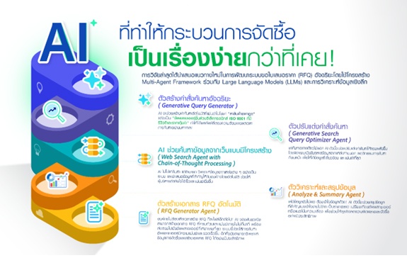 การยกระดับการสร้าง RFQ ด้วย AI และ multi-agent framework พันธวณิชได้ทำการ วิจัยและพัฒนาระบบ RFQ อัจฉริยะด้วย multi-agent framework ผสานพลังของ Large Language Models (LLMs) และ data analytics ผ่านองค์ประกอบสำคัญ 5 ส่วนคือ ตัวสร้างคำสั่งค้นหาอัจฉริยะ (generative query generator), AI ช่วยค้นหาข้อมูลเว็บแบบมีโครงสร้าง (web search agent with Chain-of-Thought processing), ตัวสร้างเอกสาร RFQ อัตโนมัติ (RFQ generator agent), ตัวปรับแต่งคำสั่งค้นหา (generative search query optimizer agent) และ ตัววิเคราะห์และสรุปข้อมูล (analyze & summary agent)
