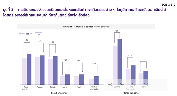กลุ่มที่สอง คือ กลุ่มที่ยังมีฐานที่เล็กกว่า แต่กำลังเติบโตขึ้นอย่างรวดเร็ว ได้แก่ กลุ่มครีเอเตอร์เกี่ยวกับบ้าน เทคโนโลยี และสัตว์เลี้ยง โดยสัตว์เลี้ยงเป็นหมวดที่เติบโตเร็วที่สุดมีอัตราการเติบโตเฉลี่ยต่อปี (CAGR 2022-2024) สูงถึง 19% ตามมาด้วยหมวดเกี่ยวกับบ้านที่ 12% และกลุ่มเทคโนโลยีที่ 8% การเติบโตที่แข็งแกร่งเหล่านี้สะท้อนถึงการเปลี่ยนแปลงพฤติกรรมของผู้บริโภคในภูมิภาคเอเชียตะวันออกเฉียงใต้ โดยเฉพาะการให้ความสำคัญกับไลฟ์สไตล์และคุณภาพชีวิตในด้านต่างๆ อย่างเช่น การตกแต่งบ้าน และการเลี้ยงสัตว์เลี้ยง ขณะเดียวกันความสนใจในเทคโนโลยีและ Gadget ก็เพิ่มขึ้นอย่างต่อเนื่องด้วย