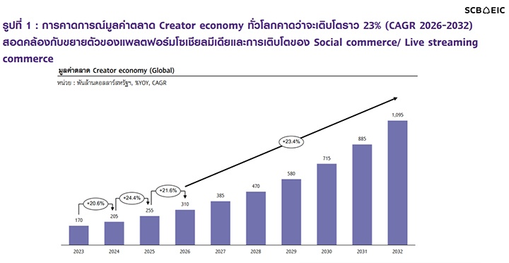 จากข้อมูลของ Grand View Research คาดการณ์ว่า Creator economy ทั่วโลกมีแนวโน้มขยายตัวต่อเนื่อง โดยจะเติบโตเฉลี่ยราว 23% ต่อปี (CAGR 2026-2032) สำหรับในไทย Tellscore ร่วมกับศูนย์วิจัย FutureTales LAB ประเมินว่า Creator economy ขยายตัวราว 15% ในปี 2025 ที่ดูจะต่ำกว่าค่าเฉลี่ยโลกซึ่งเหตุผลส่วนหนึ่งมาจากข้อจำกัดด้านขนาดตลาดและภาษา แต่ก็แสดงให้เห็นว่ายังมีศักยภาพในการเติบโตอย่างต่อเนื่อง