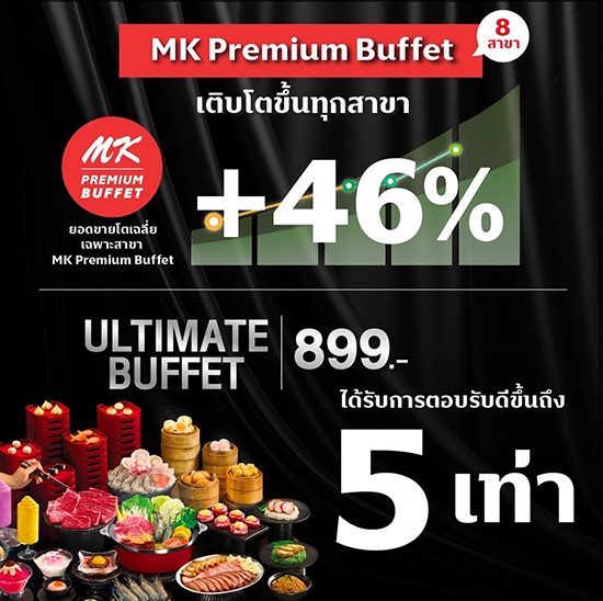 ด้าน MK Premium Buffet ที่เปิดให้บริการเมื่อเดือนกันยายน รวม 8 สาขา โดยมีปรับเมนูใหม่ให้สมกับการรอคอย ตามเสียงเรียกร้องบนโซเชียล พร้อมจัดเต็มทั้งรสชาติ, คุณภาพ รวมถึงการให้บริการที่สร้างความประทับใจให้ลูกค้า และยังตอบโจทย์ทุกความชอบ ด้วยราคาที่เข้าถึงง่าย ส่งผลให้ยอดขายเฉพาะสาขา Premium Buffet เติบโตเฉลี่ย 46% เมื่อเทียบกับช่วงเดียวกันของปีก่อน