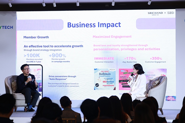 เวทีนี้ยังได้รวมผู้นำจากแบรนด์ดังระดับโลกและในไทยอย่าง ลอรีอัล กรุ๊ป และ ศรีจันทร์ ร่วมถ่ายทอดกลยุทธ์สร้าง Brand Love บน LINE โดยลอรีอัล เน้นกลยุทธ์สร้างความเชื่อมั่นผ่านนวัตกรรมและความเชื่อใจ จากตัวอย่างแคมเปญ Skin Analyzer และบริการ Beauty Consultant ผ่านแชต 1:1 บน LINE OA ช่วยให้ลูกค้าได้รับคำแนะนำผลิตภัณฑ์เฉพาะบุคคลตรงตามปัญหาผิวจริงอย่างใกล้ชิด ในขณะที่ศรีจันทร์เลือกใช้ LINE OA เป็นศูนย์กลางสร้างความสัมพันธ์กับลูกค้าแบบเรียลไทม์ผ่านระบบ Srichand Rewards ที่มีสมาชิกเพิ่มขึ้นกว่า 100,000 รายในช่วง 3 เดือน และสามารถเพิ่ม Engagement ได้ถึง 350% ด้วยการสื่อสารแบบ Personalized ผ่าน LINE OA