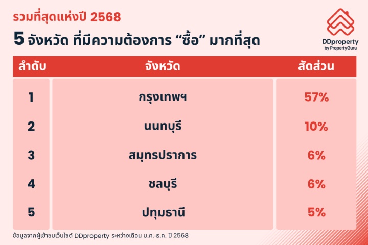 ขณะเดียวกัน หัวเมืองท่องเที่ยวยังคงได้รับความนิยมเช่นกัน หลังผู้บริโภคเริ่มมองหาบ้านในต่างจังหวัดเพื่อสร้างสมดุลระหว่างการทำงานกับการพักผ่อน ตอบโจทย์การวางแผนชีวิตในระยะยาว โดย 5 จังหวัดที่มีความต้องการซื้อมากที่สุดในรอบปี 2568 ได้แก่ กรุงเทพมหานคร นนทบุรี สมุทรปราการ ชลบุรี และปทุมธานี
