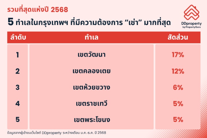 ส่วน 5 ทำเลที่มีความต้องการเช่ามากที่สุดในรอบปี 2568 ได้แก่ เขตวัฒนา เขตคลองเตย เขตห้วยขวาง เขตราชเทวี และเขตพระโขนง