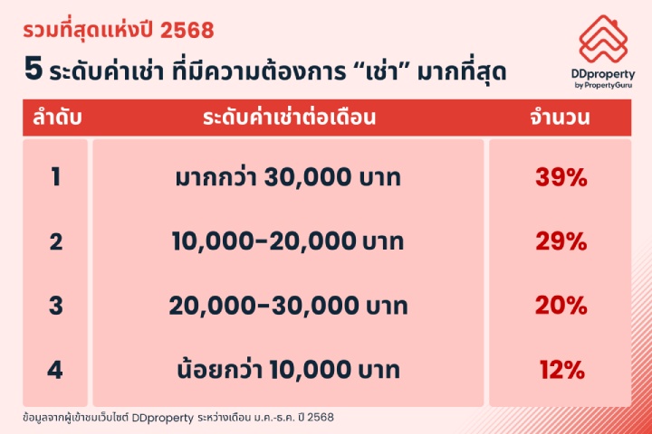 สำหรับภาพรวมระดับค่าเช่าที่ผู้บริโภคให้ความสนใจมากที่สุดอยู่ในระดับมากกว่า 30,000 บาท มีสัดส่วนถึง 39% ซึ่งถือเป็นค่าเช่าที่อยู่ในระดับค่อนข้างสูงของการเช่าที่อยู่อาศัยในย่านที่มีความเจริญ มาพร้อมสิ่งอำนวยความสะดวกครบครัน หรือตั้งอยู่ในทำเลแนวรถไฟฟ้าย่านธุรกิจที่ไม่ไกลจากสถานที่ทำงานหรือสถานศึกษามากนัก แม้ระดับค่าเช่าจะสูงกว่าโครงการแถบชานเมือง แต่ถือว่าคุ้มค่าหากแลกกับความเหนื่อยล้าในการเดินทางที่ลดลง โดยระดับราคาที่อยู่อาศัยที่ชาวไทยมีความต้องการเช่ามากที่สุดในรอบปี 2568 ได้แก่