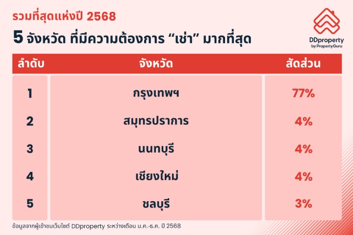 ดีดีพร็อพเพอร์ตี้ (DDproperty) แพลตฟอร์มอสังหาริมทรัพย์ เผยข้อมูลเชิงลึกจากผู้เข้าเยี่ยมชมในเว็บไซต์ในรอบปี 2568 ที่เข้ามาใช้ฟีเจอร์ค้นหา (Search) รวมถึงข้อมูลที่แสดงความสนใจชมประกาศขาย-ให้เช่า และกรอกข้อมูลให้ติดต่อกลับ ซึ่งถือเป็นกลุ่มผู้บริโภคที่มีศักยภาพในการซื้อและเช่าในอนาคตมากที่สุด สะท้อนให้เห็นเทรนด์ความต้องการซื้อและเช่าที่อยู่อาศัยของผู้บริโภคชาวไทยทั่วประเทศในรอบปีที่ผ่านมา พร้อมอัปเดตทำเลศักยภาพที่มีแนวโน้มการเติบโตอย่างน่าสนใจในอนาคต