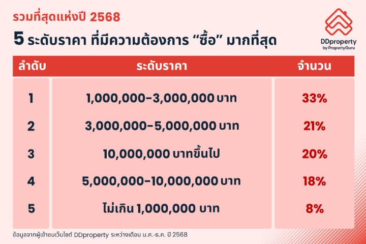 ดังนั้น ที่อยู่อาศัยในราคาที่จับต้องได้ในทำเลชานเมืองที่เดินทางสะดวก จึงตอบโจทย์ผู้ซื้อเพื่ออยู่อาศัยจริงที่ต้องการมีบ้านในเวลานี้มากที่สุด โดยระดับราคาที่อยู่อาศัยที่ชาวไทยมีความต้องการซื้อมากที่สุดในรอบปี 2568 ได้แก่