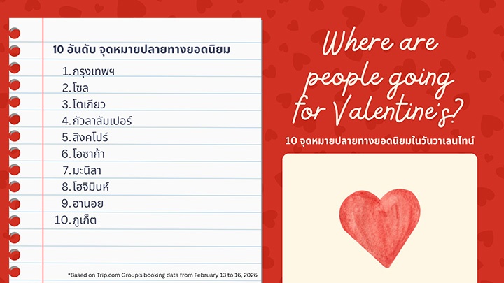 Trip.com เผย กรุงเทพฯ ครองอันดับ 1 เมืองฮิตฉลอง 'วาเลนไทน์' ชี้กระแสทริป 'กิน-เที่ยว' Food Travel ทั่วโลกดันยอดจองเกี่ยวกับด้านอาหารพุ่ง 43%