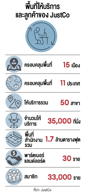 ปัจจุบัน JustCo มีสาขาพื้นที่สำนักงาน 50 แห่ง ครอบคลุม 15 เมืองสำคัญๆ ในหลายประเทศทั่วเอเชียแปซิฟิก ทั้งสิงคโปร์ ไทย มาเลเซีย เวียดนาม ฟิลิปปินส์ ไต้หวัน เกาหลีใต้ ญี่ปุ่น และออสเตรเลีย โดยในไทย JustCo เข้ามาเปิดบริการในปี 2561 มี 6 สาขา พื้นที่ให้บริการรวม 30,000 ตารางเมตร บริการกว่า 6,000 ที่นั่ง และนับเป็น 1 ใน 3 ของผู้ให้บริการพื้นที่สำนักงานแบบยืดหยุ่นในประเทศไทย