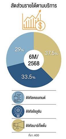 สำหรับภาพรวมธุรกิจในครึ่งปีหลัง 2568 บริษัทยังคงมุ่งเน้นการให้บริการใน 3 กลุ่มธุรกิจหลักคือ การให้บริการดิจิทัลคอนเทนต์ ดิจิทัลโซลูชัน และการตลาดดิจิทัล ซึ่งได้รับการสนับสนุนเพิ่มเติมด้วยบริการจากการสร้างรายได้จากดนตรี ซึ่งเป็นแหล่งรายได้ใหม่ที่เพิ่มเข้ามาหลังจากการลงทุนใน GLORY และ OCEAN และจะเป็นบริการที่มีบทบาทสำคัญในการสร้างการเติบโตให้กับบริษัทในระยะไม่กี่ปีข้างหน้า และการลงทุนหลังจากนี้บริษัทยังคงโฟกัสธุรกิจที่เป็นเมกะเทรนด์คือ IT และการเงิน