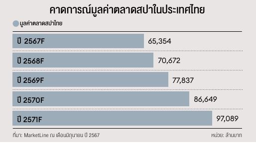 สำหรับอุตสาหกรรมสปาในประเทศไทย มีแนวโน้มเติบโตอย่างต่อเนื่องจากข้อมูลของ MarketLine คาดการณ์อัตราการเติบโตเฉลี่ย 9.4% ต่อปี (CAGR ปี 2566-2571F) โดยจะส่งผลให้มูลค่าตลาดสปาในประเทศเพิ่มขึ้นเป็น 9.71 หมื่นล้านบาทในปี 2571 ซึ่งปัจจัยสนับสนุน เช่น กระแสการดูแล สุขภาพ ความต้องการประสบการณ์ที่แตกต่าง ความก้าวหน้าทางเทคโนโลยี และการนำเทคโนโลยีดิจิทัลประยุกต์ใช้กับการให้บริการสปารายได้เพิ่มขึ้น การขยายตัวของอุตสาหกรรมการท่องเที่ยว รวมถึงนโยบายส่งเสริมการท่องเที่ยว และการปรับปรุงโครงสร้างพื้นฐานในประเทศเพื่อรองรับนักท่องเที่ยว