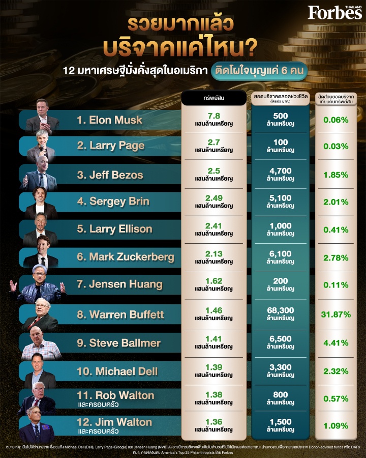 และถ้าลองดูในบรรดาบุคคลที่ร่ำรวยที่สุด 12 อันดับแรกของสหรัฐฯ มีเพียง "ครึ่งเดียว" เท่านั้นที่มีชื่อติดอยู่ในโผ 25 อันดับผู้บริจาครายใหญ่ที่สุดของ Forbes โดยอันดับหนึ่งคือ Warren Buffett ซึ่งครองอันดับ 1 มหาเศรษฐีอเมริกันใจบุญประจำปีนี้