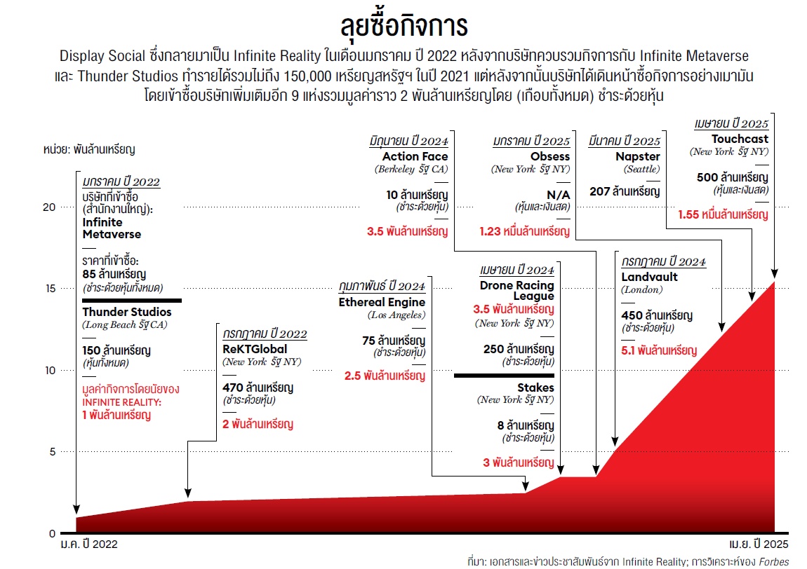 ในช่วงกลางเดือนเมษายน Infinite Reality ปรับมูลค่าประเมินกิจการเพิ่มขึ้นอีกครั้งเป็น 1.55 หมื่นล้านเหรียญหลังจากเข้าซื้อธุรกิจสร้างอวาตาร์เสมือนจริงด้วยเทคโนโลยี AI โดยชำระเป็นหุ้นของบริษัททั้งหมด ตัวเลขดังกล่าวดูจะเกินจริงไปมาก Infinite Reality ซึ่งเมื่อไม่นานมานี้เพิ่งเปิดตัวผลิตภัณฑ์หลักอย่างเครื่องมือเปลี่ยนเว็บไซต์ให้กลายเป็น “ร้านค้าเสมือน 3 มิติ" กล่าวว่า บริษัทมีรายได้ 75 ล้านเหรียญในปี 2024 เพิ่มขึ้นจาก 50 ล้านเหรียญเมื่อปี 2023 หากมูลค่าประเมินอยู่ที่ 1.55 หมื่นล้านเหรียญ เท่ากับว่าบริษัทมีมูลค่ามากกว่ารายได้ถึง 200 เท่า ซึ่งสูงกว่าสตาร์ทอัพด้าน AI ที่ ร้อนแรงที่สุดในขณะนี้อย่าง Anthropic (มูลค่ามากกว่ารายได้ประมาณ 44 เท่า) และ OpenAl (ประมาณ 24 เท่า) อย่างเทียบไม่ติด