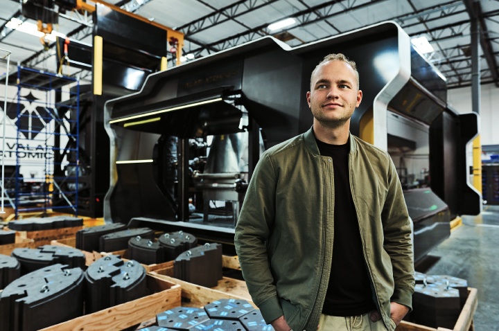 ณ โรงงานพื้นที่ 40,000 ตารางฟุตของ Aalo Atomics ทางตอนใต้ของเมือง Austin รัฐ Texas คนงานนำแผ่นเหล็กหนาเศษ 5 ส่วน 8 นิ้ว ป้อนเข้าสู่เครื่องจักรเพื่อดัดและม้วนช้าๆ จนกลายเป็นทรงกระบอกเส้นผ่านศูนย์กลาง 12 ฟุต แล้วนำมาเชื่อมต่อกันเป็นถังปฏิกรณ์สูง 25 ฟุต