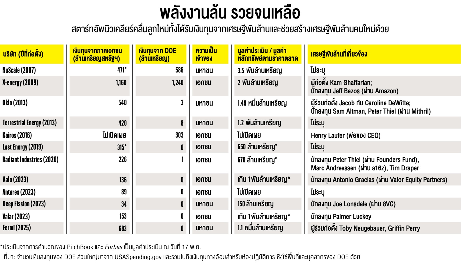 มีสตาร์ทอัพ 1 รายที่หาเงินได้จากกระแสความตื่นเต้นฮือฮาโดยที่ยังไม่ได้สร้างโรงงานนำร่องเลยด้วยซ้ำ นั่นคือ Oklo ที่ก่อตั้งเมื่อปี 2013 โดยสามีภรรยา Jacob กับ Caroline DeWitte และเคยมี Sam Altman CEO ของ OpenAI เป็นประธานกรรมการมาตั้งแต่ปี 2015 จนถึงเดือนเมษายนปีที่ผ่านมา บริษัทนี้เข้าจดทะเบียนในตลาดหลักทรัพย์ผ่านบริษัทในรูปแบบ SPAC ในปี 2024 และมีมูลค่าหลักทรัพย์ตามราคาตลาดอยู่ที่ 1.5 หมื่นล้านเหรียญ (ลดลงจากจุดสูงสุดที่ 2.6 หมื่นล้านเหรียญในเดือนตุลาคมที่ผ่านมา) ทำให้สองสามีภรรยา DeWitte กลายเป็นเศรษฐีพันล้าน