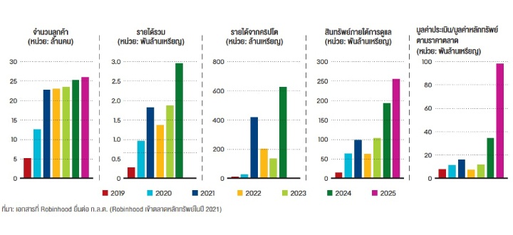 แม้จำนวนลูกค้าจะพุ่งขึ้นในปี 2019, 2020 และ 2021 แต่ Robinhood ต้องรอมาถึงปี 2024 กว่าที่รายได้จากคริปโตและมูลค่าหลักทรัพย์ตามราคาตลาดของบริษัทจะโตระเบิด