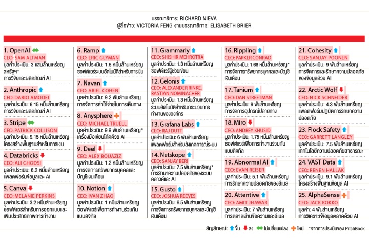 Forbes ร่วมกับ Bessemer Venture Partners และ Salesforce Ventures จัดทำทำเนียบบริษัทคลาวด์คอมพิวติ้งเอกชนชั้นนำของโลกประจำปี พบว่า ในการจัดอันดับปีที่ 10 นี้ AI ครองทำเนียบอย่างยิ่งใหญ่ โดยเฉพาะอย่างยิ่ง OpenAI ยังคงยืนหนึ่งอย่างแข็งแกร่ง โดยมีคู่แข่ง Anthropic ตามมาติดๆ (ขึ้นจากอันดับ 5) Anysphere น้องใหม่ผู้ผลิต Cursor เครื่องมือสำหรับเขียนโค้ดด้วยเ AI ยอดนิยม ทะยานเกาะ 10 บริษัทแถวหน้าด้วยอันดับที่ 8 ส่วน Ramp บริษัทฟินเทคที่เพิ่งติดทำเนียบเป็นครั้งแรกเมื่อปีที่แล้วกระโดดจากอันดับ 37 มาเป็นที่ 6 ส่วนบริษัท 25 แถวหน้ามีดังนี้