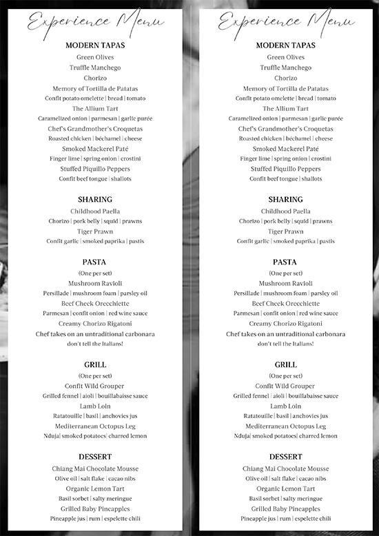 ทั้งนี้ ในส่วนของเซ็ท Experience Menu จะมีอาหารจานเด็ดที่รังสรรค์ขึ้นมาใหม่ อาทิ Stuffed Piquillo Peppers : พริกปิควิโยยัดไส้กับลิ้นวัวตุ๋น, Mediterranean Octopus Leg : สตูว์ปลาหมึก, Creamy Chorizo Rigatoni : ไส้กรอกโชริโซ, Confit Wild Grouper : ปลาเก๋าเสิร์ฟพร้อมสลัดเฟนเนล เป็นต้น โดยการเสิร์ฟอาหารจะเริ่มต้นด้วย Modern Tapas อาหารเรียกน้ำย่อยขนาดพอดีคำที่มีอยู่ในลิต์ทั้งหมด ถัดมาจะเป็นการเสิร์ฟอาหารจากเมนู Sharing ทั้ง 4 รายการ, หลังจากนั้น ลูกค้าแต่ละท่านสามารถเลือกเมนู Pasta ได้ตามใจชอบ 1 รายการ และ เมนู Grill อีก 1 รายการ พร้อมปิดท้ายด้วยเมนู Dessert หรือ ขนมหวาน ที่อร่อยน่ารับประทานในทุกๆ จาน รวมถึงทุกเมนูยังจัดจานออกมาได้โดดเด่นเหมาะแก่การโพสต์ลง Social สร้างโมเมนต์ดีๆ ได้อีกทางหนึ่ง