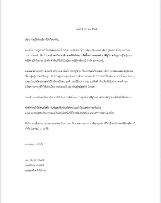 ข้าพเจ้า นายชนินทธ์ โทณวณิก นางสินี เรียรประสิทธิ์ และ นางสุนงค์ สาลีรัฐวิภาค ขอเรียนให้ทุกท่านที่นับถือได้ทราบว่า บัดนี้ ข้าพเจ้าได้เห็นพ้องต้องกันที่จะยุติข้อขัดแย้งดังกล่าวแล้ว โดยจะนำความเห็นต่างและความปรารถนาดีของทุกฝ่ายที่เป็นประโยชน์มาใช้ในการพัฒนาธุรกิจ และกิจการของบริษัทต่อไป