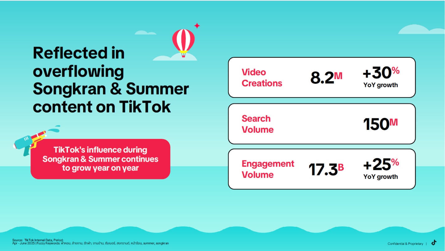 จากอินไซต์ของ TikTok ที่สงกรานต์เคยถูกมองว่าเป็นเพียงช่วงเวลา Peak สั้นๆ ได้ถูกนิยามใหม่ในปี 2026 สู่การเป็น Sustained Seasonal Economy ที่เติบโตอย่างต่อเนื่องและมั่นคง และได้เปลี่ยน Consumer Journey ของคนไทยให้เป็นวัฏจักรที่ลื่นไหลระหว่างการค้นพบสิ่งใหม่และการเข้าไปมีส่วนร่วมอย่างสร้างสรรค์ ด้วยการเติบโตอย่างแข็งแกร่งของการสร้างคอนเทนต์ การค้นหา และการมีส่วนร่วมบนแพลตฟอร์ม